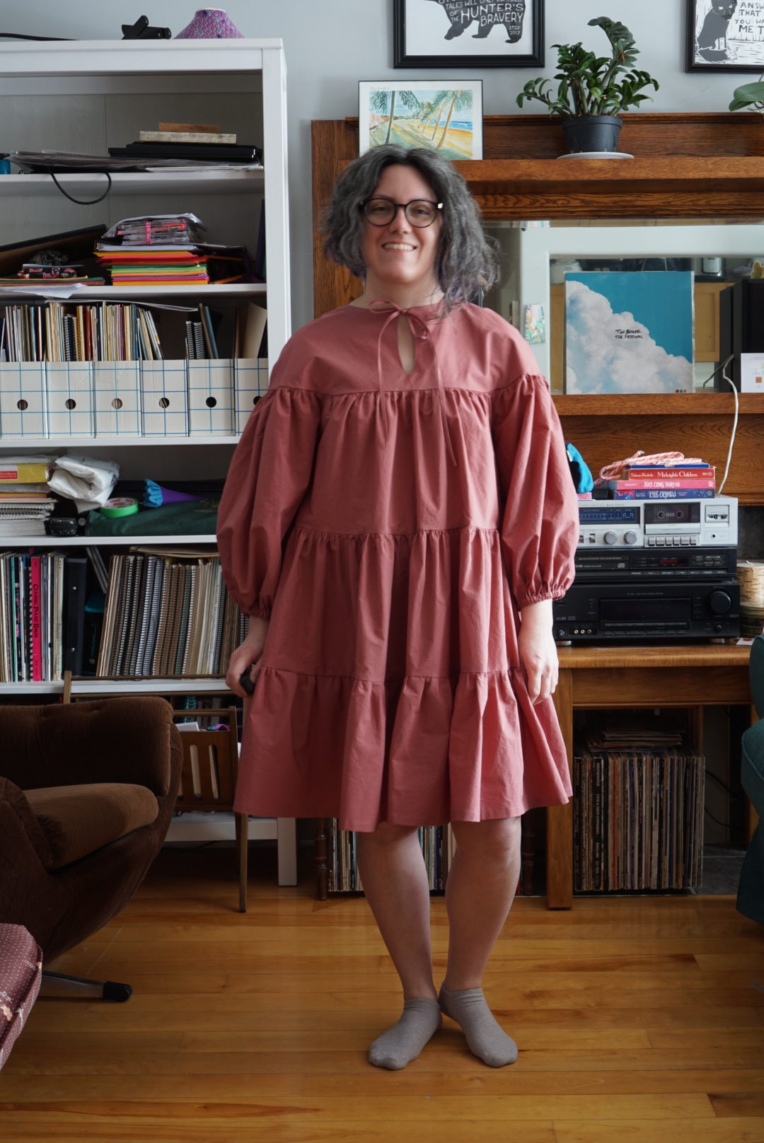 So often when a dress is super voluminous, it’s tempting to only include fun photos of the dress held to its full width or little videos of the dress swirling in a beautiful blur. I love those photos and videos! But sometimes it’s hard to find as many photos with the dress hanging as it would be more likely to in day-to-day wear. So those photos are above and below. And I really love how this dress looks both ways, both in motion and “at rest”! This dress is sewn in a cotton poplin that I got from Patch, which I was honestly not sure about. It felt like it could potentially be too structured. I think in future I want to try a midweight linen for a more rumpled look, but I am super pleased with how this one turned out. I think the poplin really helps the dress to keep a good amount of volume even when it’s not being swirled, and I imagine it will relax a bit more after multiple washes. It’s already surprisingly soft, counter to what you might think based on its appearance! I made a size 14 based on my full bust measurement (40″), even though I was temped to size down based on the volume. I’m glad I didn’t size down because my bigger shoulders from swimming and climbing are often the obstacle in fitting into a single size column, and this is not fitted anywhere except the shoulders! The awesome thing about Veronica Tucker is that even though her patterns only go up to a size 22 (48″ bust, 40″ waist, 51.5″ hips), if you don’t fit into her size range she will draft a size specifically for you at no additional cost if you provide your measurements!